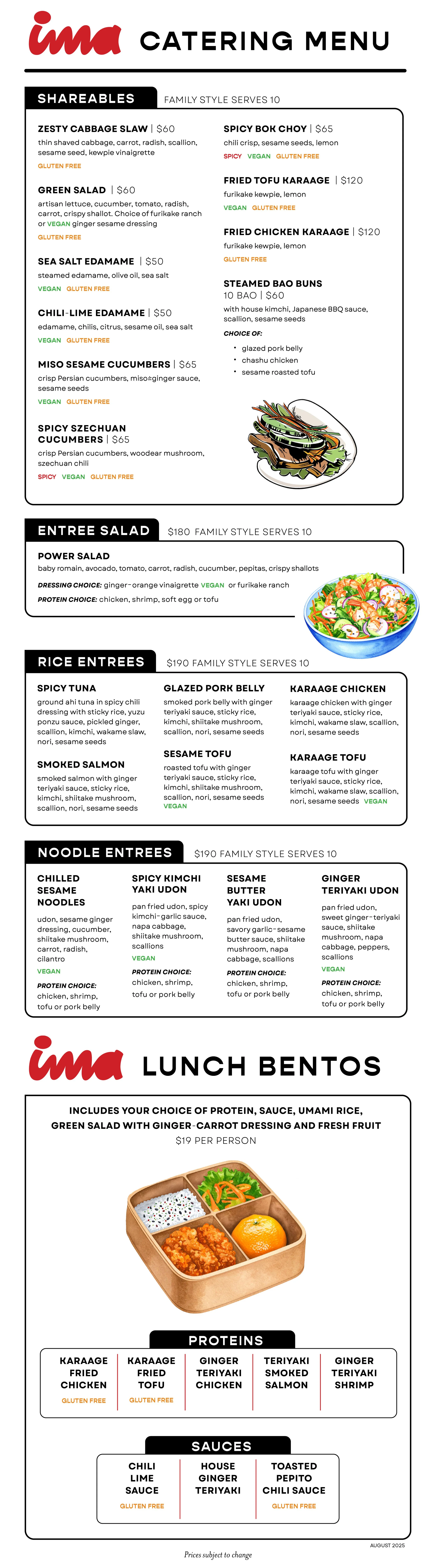 From shared salads and rice bowls to pan-fried noodles and individual bento box lunches, our catering brings bold, comforting flavors crafted with the same care and exceptional quality that has made Ima a Detroit institution. Perfect for groups of 10-150 people, from vegan & vegetarian to gluten-free, we have options for a variety of dietary preferences. Every dish is designed to bring people together around our award-winning Japanese-inspired cuisine.